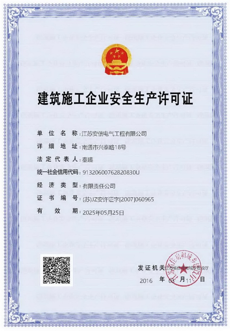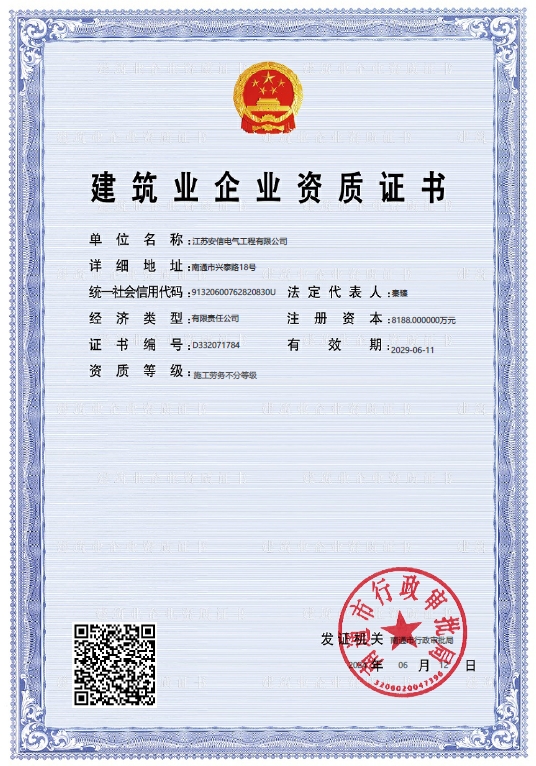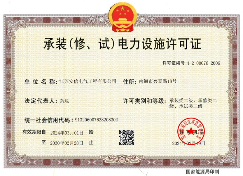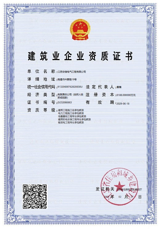 在創(chuàng)業(yè)之初,公司就堅持高起點的戰(zhàn)略思路,廣納賢才,集聚行業(yè)精英,創(chuàng)新發(fā)展,做優(yōu)企業(yè)品牌。現(xiàn)已取得:承裝二級、承修二級、承試二級,電力工程施工總承包二級,輸變電工程專業(yè)承包二級,建筑工程施工總承包二級,建筑機電安裝專業(yè)承包二級,地基基礎專業(yè)承包二級資質證書,并通過了質量、環(huán)境、職業(yè)健康和安全管理體系認證,確保各項工作有序管控。